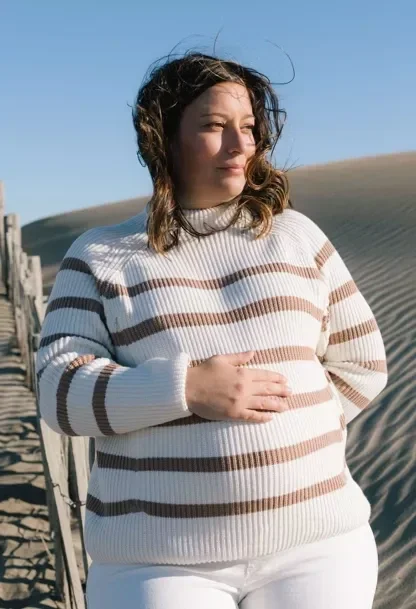Le grand classique français de la marinière revisité avec une touche du style preppy de la côte-est américaine, en 100% Coton bio certifié GOTS, rayures Camel, légèrement oversize. Le pull SEA BREEZE permet d'allaiter facilement grâce à ses ouvertures latérales zippées. Une bande tricotée à l'intérieur garantit encore plus de discrétion à la maman allaitante. Avec son col cheminée et son point de côtes anglaises i