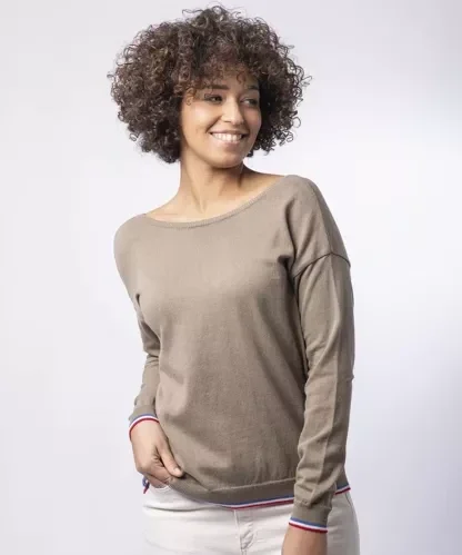 Le pull décolleté 2 EN 1 en taupe et en coton bio reste un incontournable de la garde robe féminine